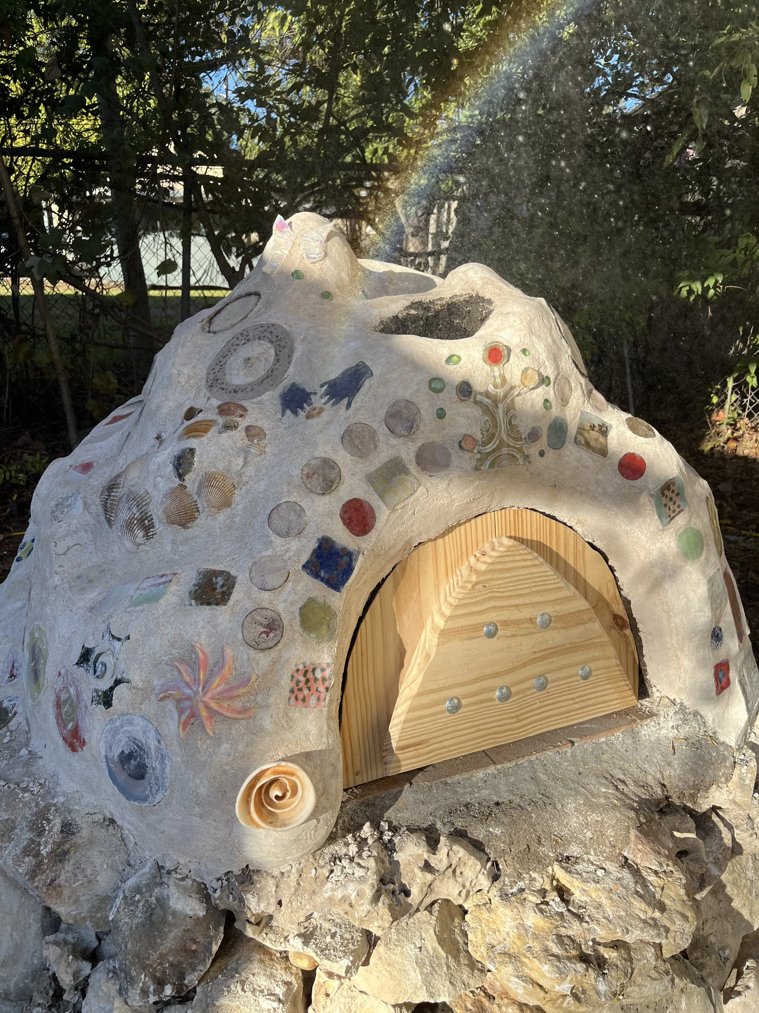 Using natural building techniques we created a cob oven using locally sourced materials- limestone, soil, sand, and straw. It's decorated with recycled ceramic pieces made during our summer Clay ReWork-Shop, where we reimagined broken bisque and glaze ware into tile and mosaic. The oven will be a permanent part of MASS Gallery and a space for sharing food and community on a regular basis.