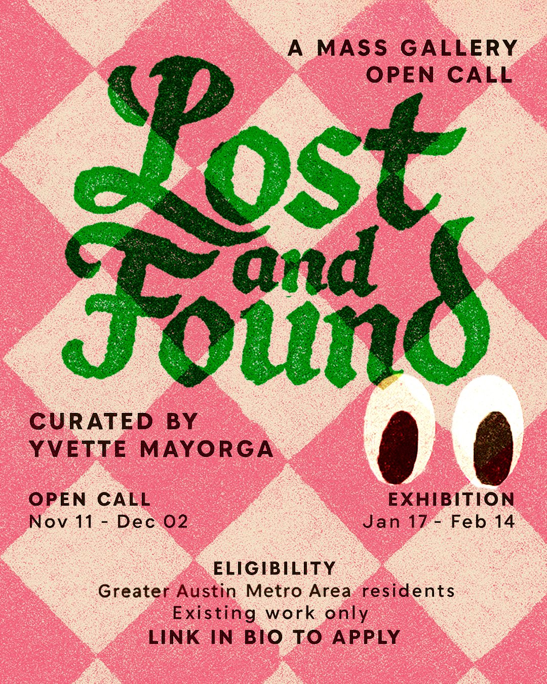 Lost and Found is a project organized by MASS in collaboration with artist Yvette Mayorga, who is in the early research and development phase of a major public art commission for the new terminal at Austin-Bergstrom International Airport, slated to open in 2030. Drawing from her ancestral ties to the Bracero Program—Mayorga reflects on the emotional resonance of personal objects carried across borders and generations. Extending this reflection outward, she invites fellow creatives to share their own stories of “lost and found,” while also considering migration within broader ecological contexts, including the interconnected flora and fauna of Texas and Mexico. Because this is a public art project, selected work must be family-friendly and appropriate for public viewing.